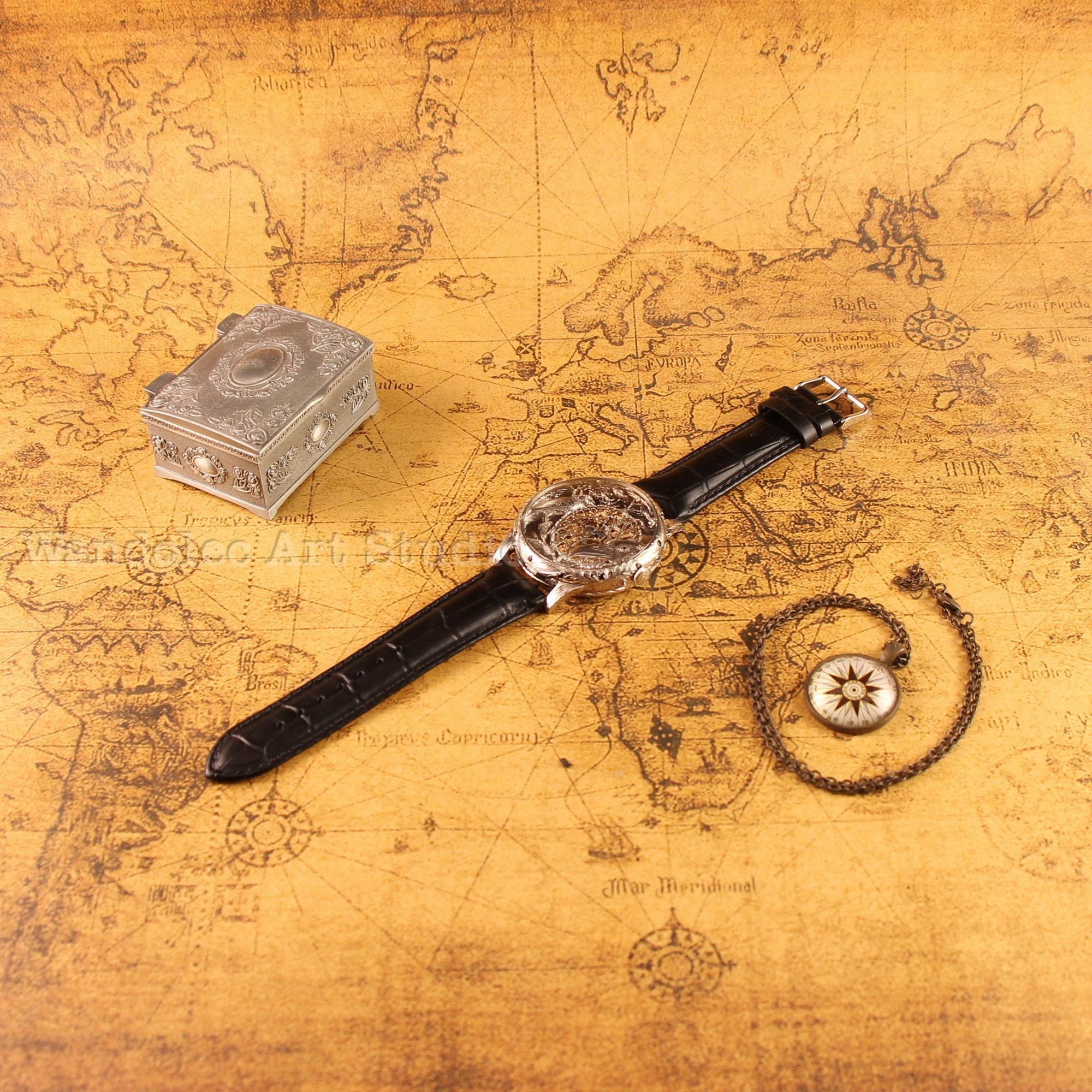 It is a registered design 3D VOLUME model that features a three piece CHROMED brass case that provides with glass cover of back lid. This watch was converted from pocket watch. CHROMED case, new custom made, fantastic, build of THE WANDOLEC ART STUDIO specially for this excellent Longines movement. The lugs are in great condition while the winding crown with engraved Crown is in very good shape and operates properly. The case has MINERAL glasses on the front & back side. The case is decorated with HIGH QUALITY ENGRAVING with CROWN and BRANCHES in BLACK CRYSTALS. The case was made as 3D MODEL. This is look very beautifully.