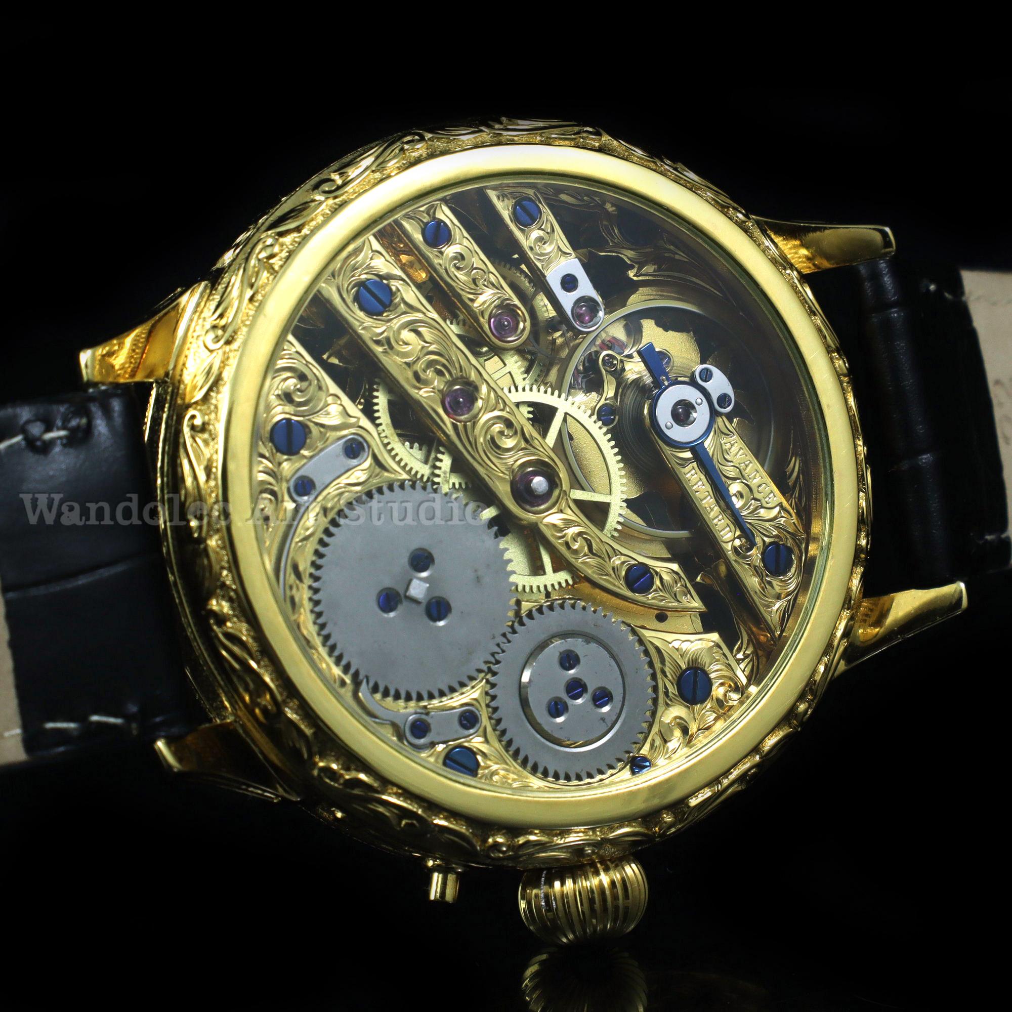 I proudly offer for sale this beautiful amazing large skeletonized dress CUSTOMIZED WATCH that decorated of the HIGHEST QUALITY FLORAL ENGRAVING and WHITE & RED STONES. Indeed, it was made by THE WANDOLEC ART STUDIO based on ORIGINAL SWISS movement.