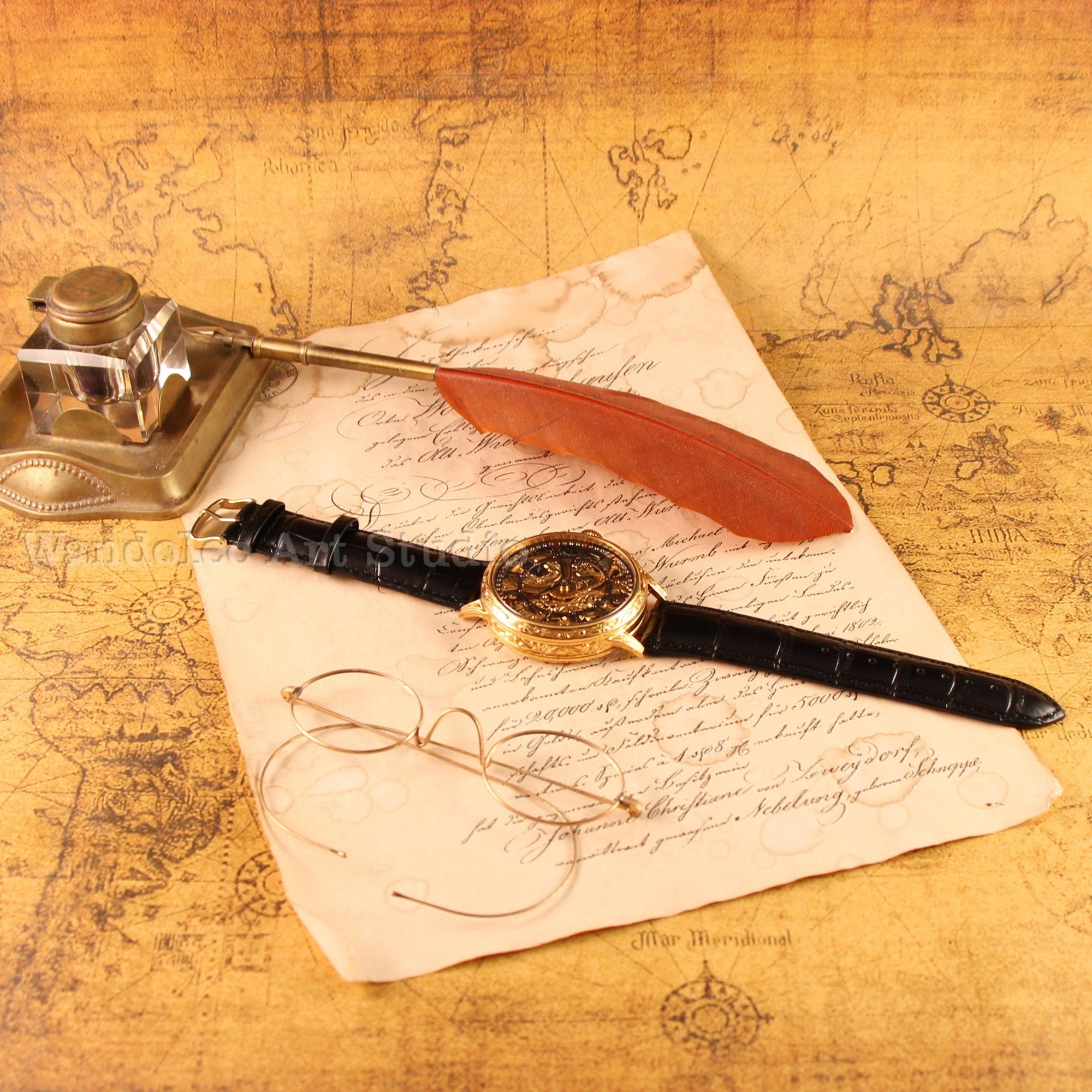 It is a registered design model that features a three piece GOLDEN brass case that provides with glass cover of back lid. The case, new custom made, fantastic, build specially for this excellent movement. This watch was converted from pocket watch. The lugs are in great condition while the winding crown is in very good shape and operates properly. The case has MINERAL glasses on the front and back side. The case is decorated HIGH QUALITY ENGRAVING.