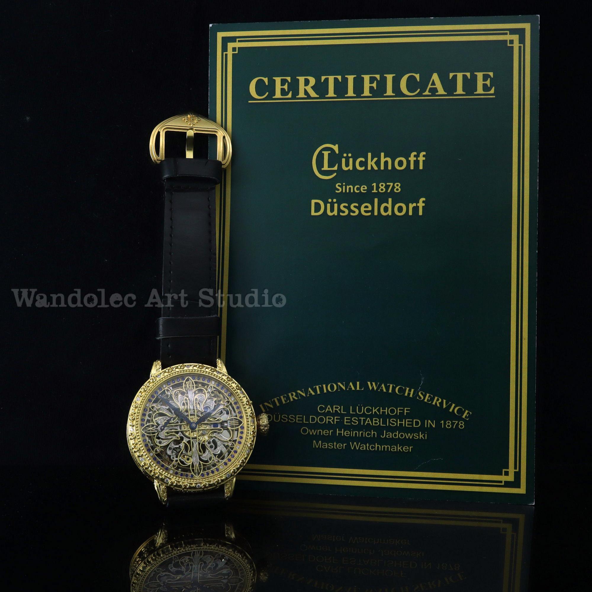 If you have been collecting watches for a while I think you’re going to appreciate the following beautiful amazing large skeletonized dress a CUSTOMIZED WATCH that dates to 1894 and decorated of the HIGHEST QUALITY ENGRAVING with CALATRAVA CROSS and BLUE & WHITE STONES, that was made by WANDOLEC ART STUDIO based on the venerable PATEK PHILIPPE movement.