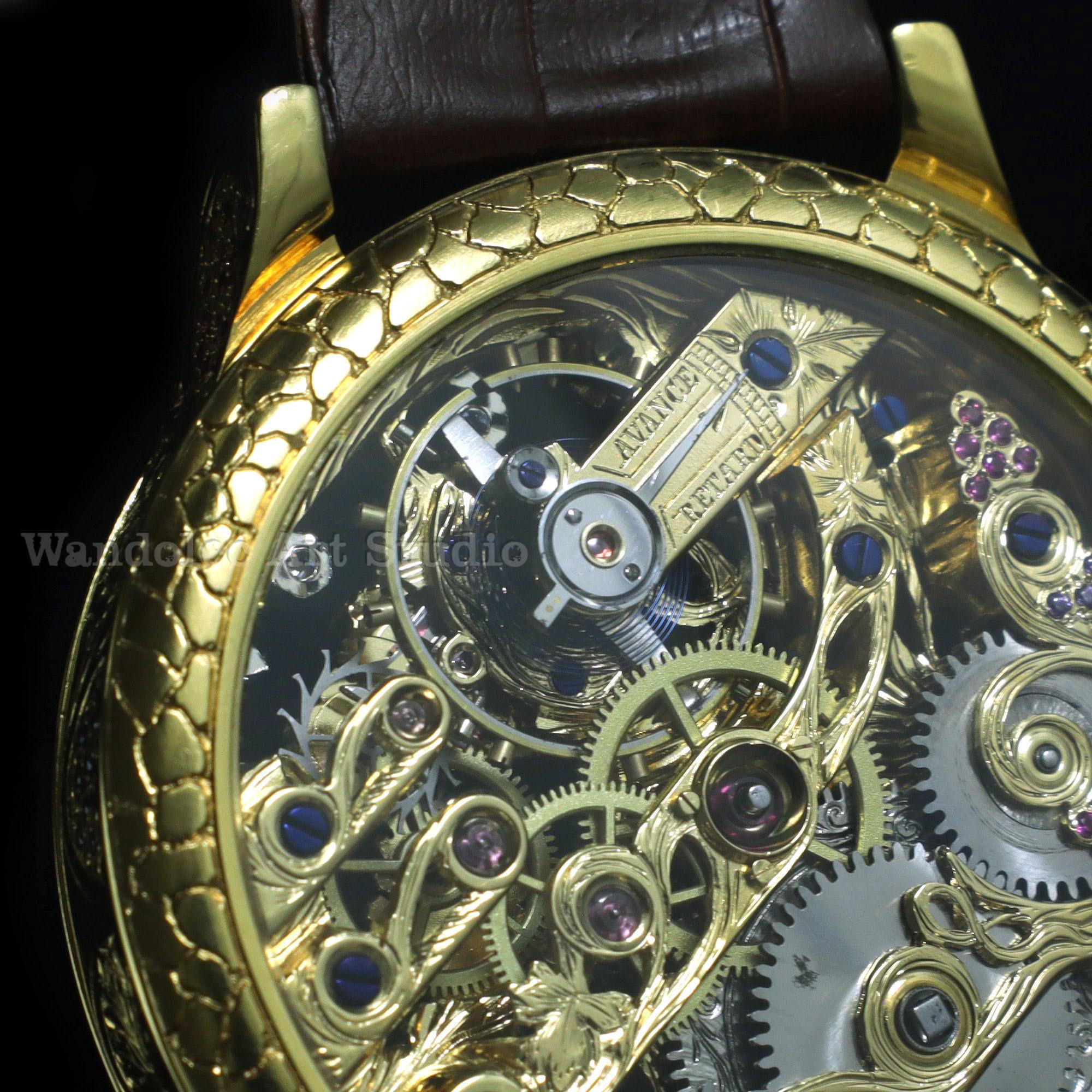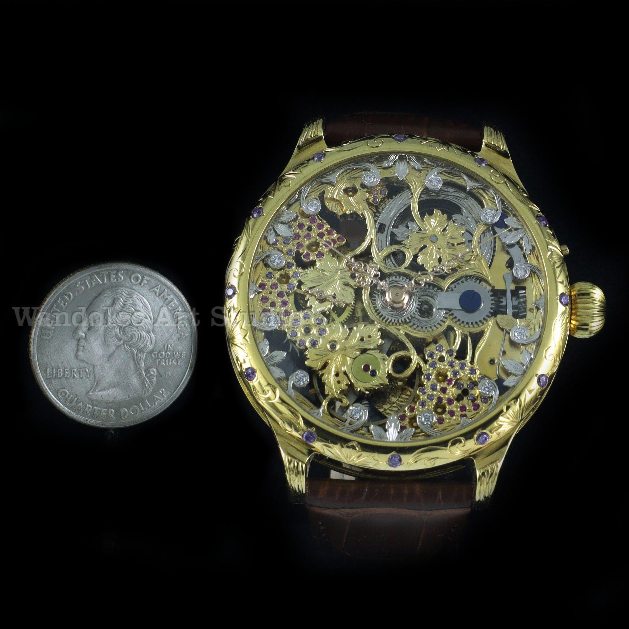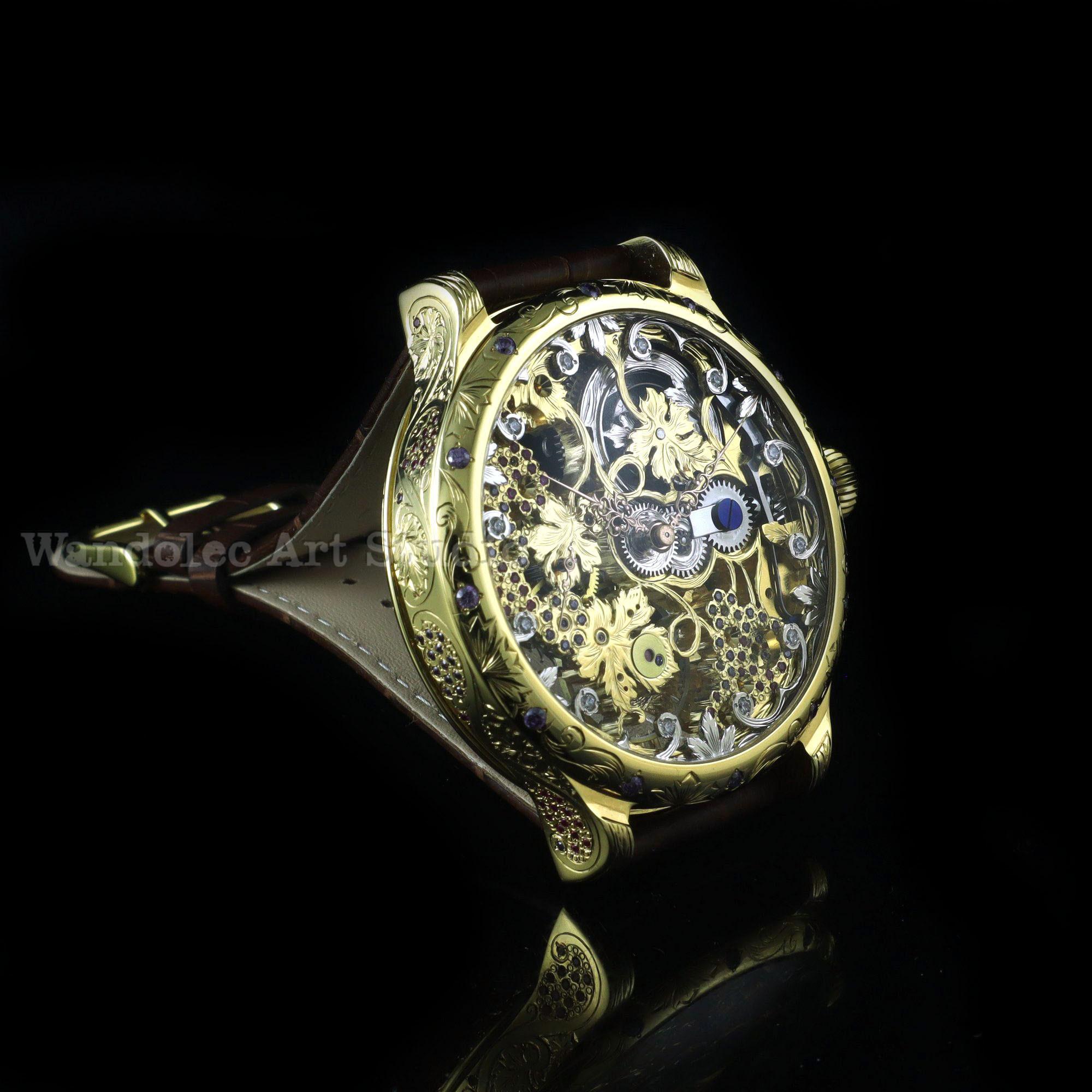 Exceptional watchmaking and timeless elegance for this beautiful amazing large engraved dress a CUSTOMIZED WATCH that decorated with the HIGHEST QUALITY GRAPES ENGRAVING and COLOUR STONES was made by THE WANDOLEC ART STUDIO based on famous SWISS movement from LeCoultre & Co.