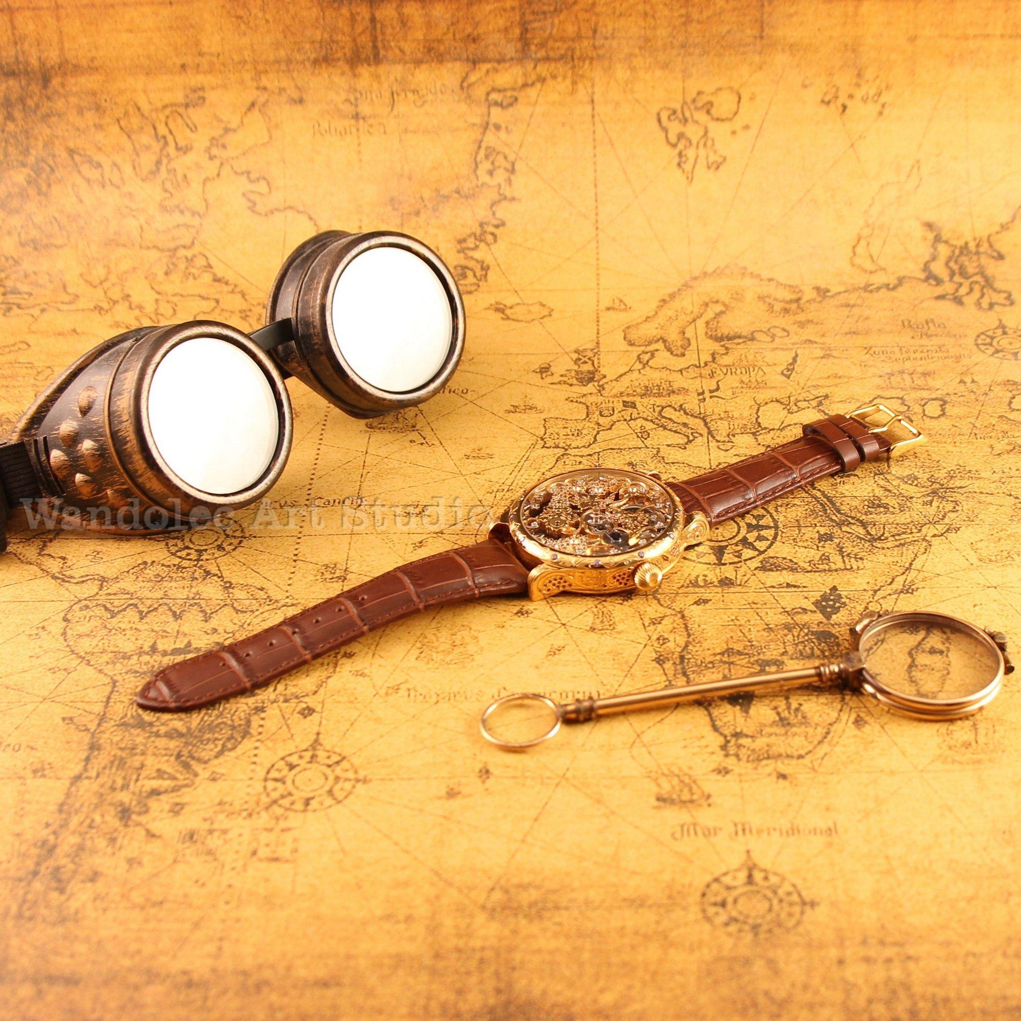It is a registered design model that features a three piece GOLD PLATED brass case that provides with glass cover of back lid. This watch was converted from pocket watch. GOLD PLATED case, new custom made, fantastic, builds specially for this excellent Le Coultre movement. The lugs are in great condition while the winding crown is in very good shape and operates properly. The case has MINERAL glasses on the front & back side. The case is decorated with HIGH QUALITY GRAPES ENGRAVING with COLOUR STONES.
