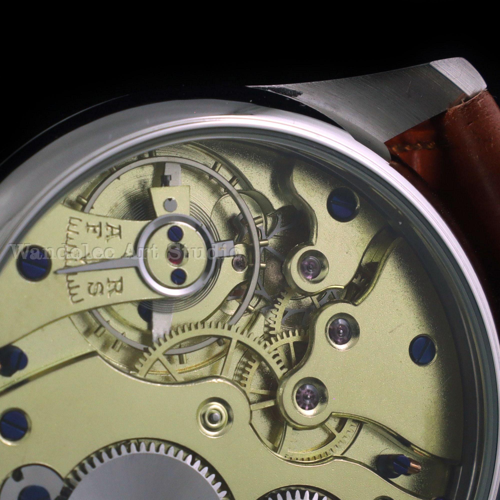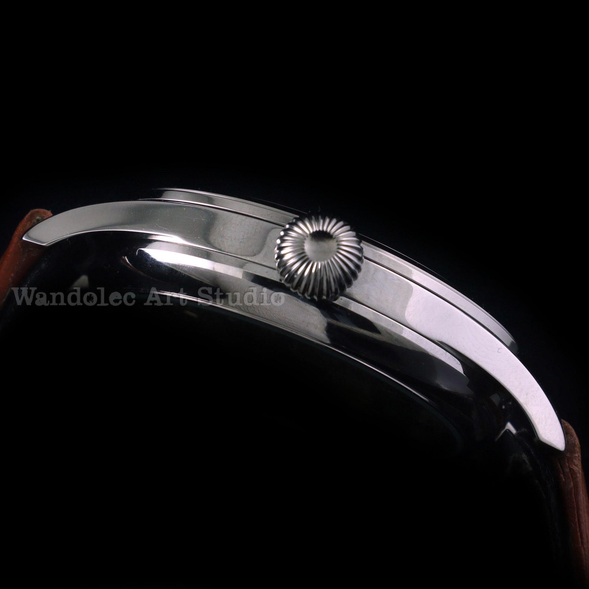 It is a registered design model that features a three piece STAINLESS STEEL CASE that provides with glass cover of back lid. This watch was converted from pocket watch. The case, new custom made, fantastic, matched specially for this excellent Swiss movement. The lugs are in great condition while the Pumpkin-style winding crown is in very good shape and operates properly. The case has MINERAL glasses on the front and back side.